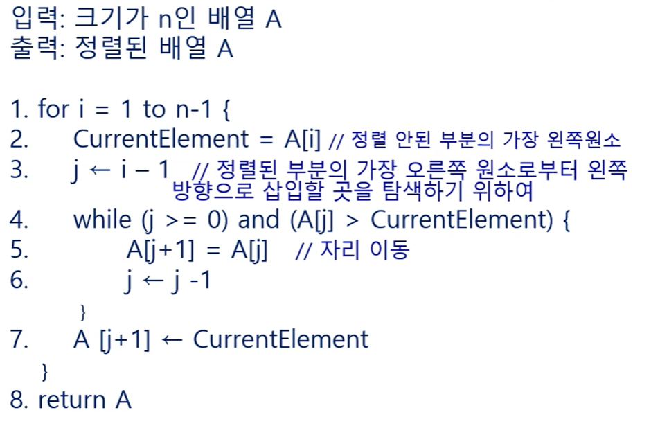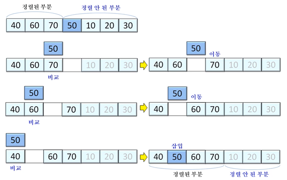 배열을 정렬된 (앞)부분과 정렬 안된 (뒷)부분으로 나누고 정렬 안된 부분의 가장 왼쪽 원소를 정렬된 부분의 적절한 위치에 삽입하는 과정을 반복해 정렬하는 알고리즘