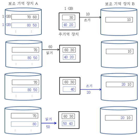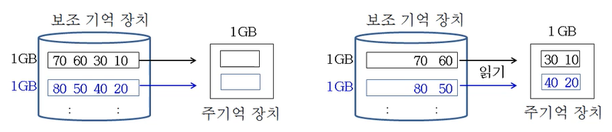 - 보조 기억 장치에 있는 입력을 나누어 주기억 장치에 읽어 들인 후, 다시 보조 기억 장치에 저장