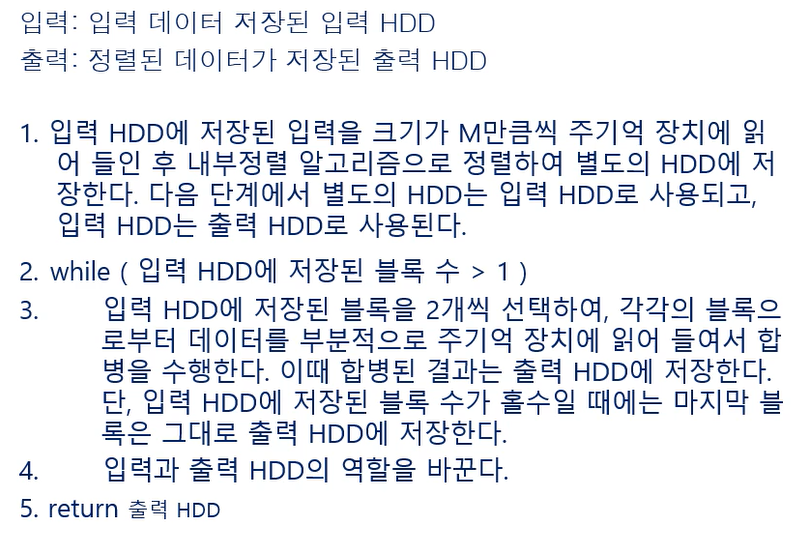 외부 정렬: 입력이 주기억 장치(내부 메모리)에 있는 상태에서 정렬이 수행되는 지금까지의 내부 정렬과 달리, 입력 크기가 매우 커서 보조 기억 장치에 입력을 저장할 수 밖에 없는 상태에서 수행되는 정렬