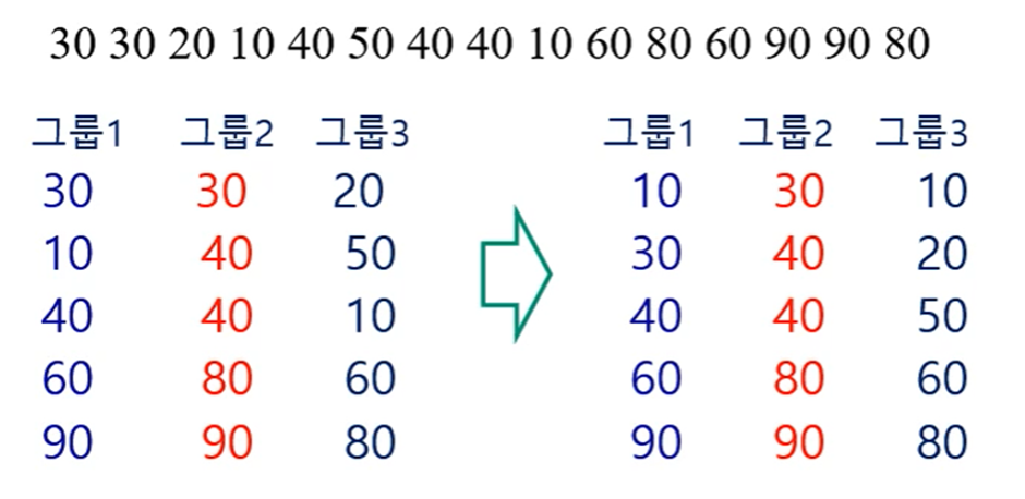 - 버블 정렬, 선택 정렬, 삽입 정렬