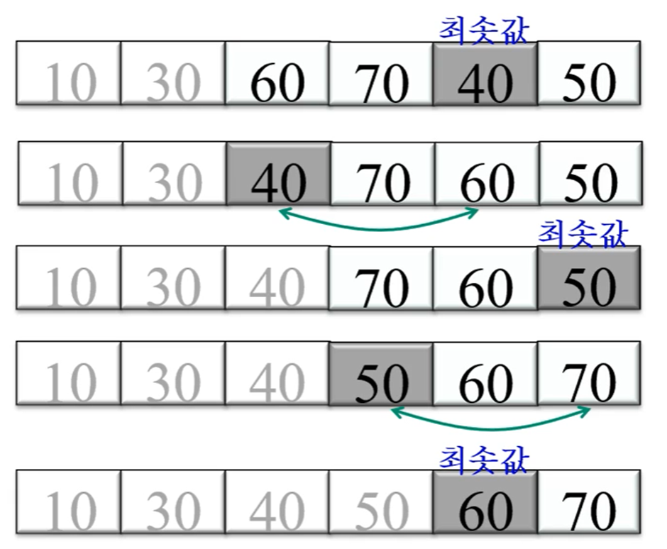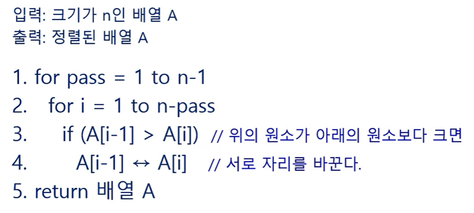 이중 for문 n(n-1)/2 / if 조건이 참일 때 자리바꿈 O(1)