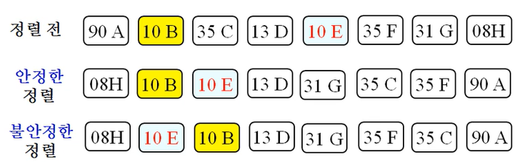 정렬 알고리즘에서, 입력에 중복된 숫자가 있을 때, 정렬된 후에도 중복된 숫자의 순서가 입력에서의 순서와 동일하면 정렬 알고리즘이 안정성(Stability)을 가진다고 한다