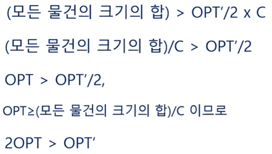 따라서 각 방법이 사용한 통의 수가 OPT'라면, (OPT'-1)개의 통에 각각 1/2 넘게 물건을 채울 때, 물건의 크기의 합은 ((OPT' - 1) * C/2) 보다는 크다