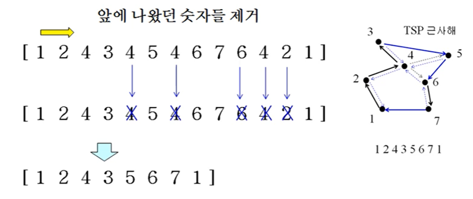 - MST의 모든 점을 연결하는 특성과 최소 가중치의 특성을 TSP에 응용해 시작 도시를 제외한 다른 모든 도시를 트리 선분을 따라 1번씩 방문하도록 경로를 찾는 것