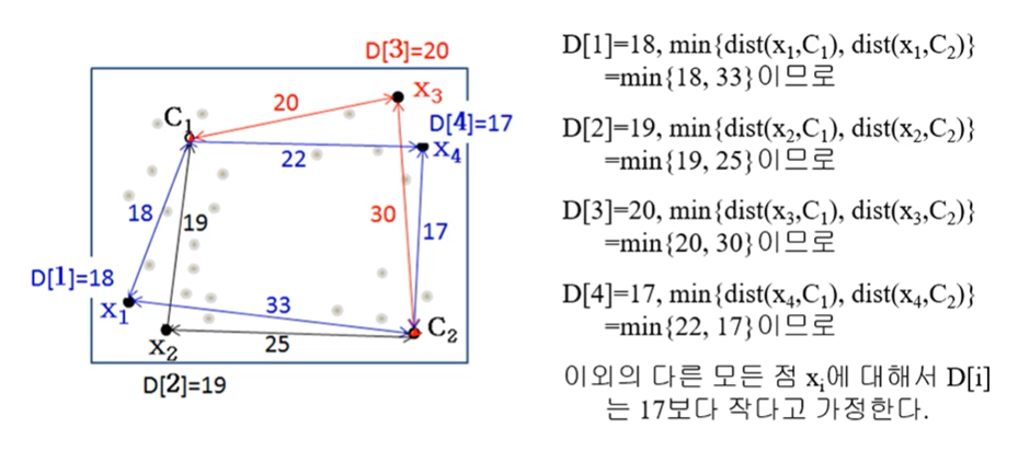 임의의 점 선택 O(1) / 각 점에서 각 센터까지의 거리 계산 O(kn) / 그 중 최대값 찾기 O(n) / for 루프 (k-1)회 반복 / 센터가 아닌 각 점으로부터 k개의 센터까지 거리 각각 계산하며 최솟값 찾기 O(kn)