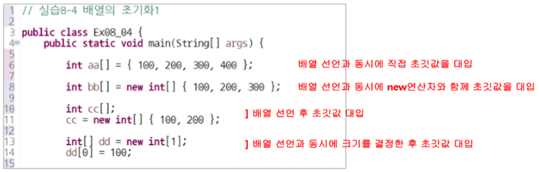 반대로 선언만하고 초기화 하지 않은 경우는 0(정수), 0.0(실수), null(객체)로 초기화