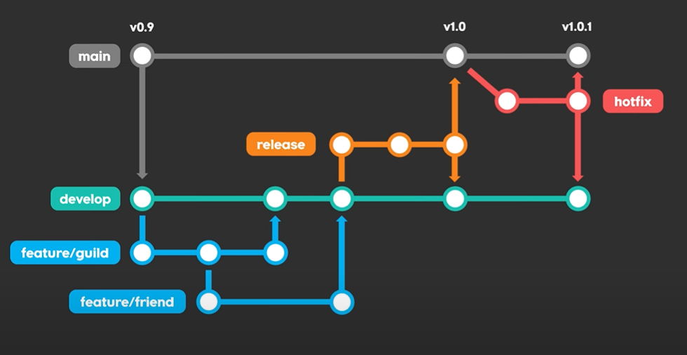 Git Flow란 규모가 큰 프로젝트를 관리하는 가장 대표적인 브랜치 전략으로 크게 5가지 브랜치를 사용한다
