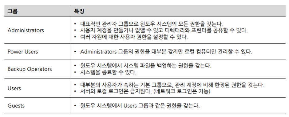 윈도우 서버는 기본적으로 운영자 권한 계정인 Administrator (기본 계정)가 있고, 일반 사용자 계정을 추가하는 형태로 계정을 관리한다. 또한 같은 권한을 가진 계정들을 그룹으로 묶어줄 수 있다 (운영자 그룹 Administrators, 사용자 그룹 Users)