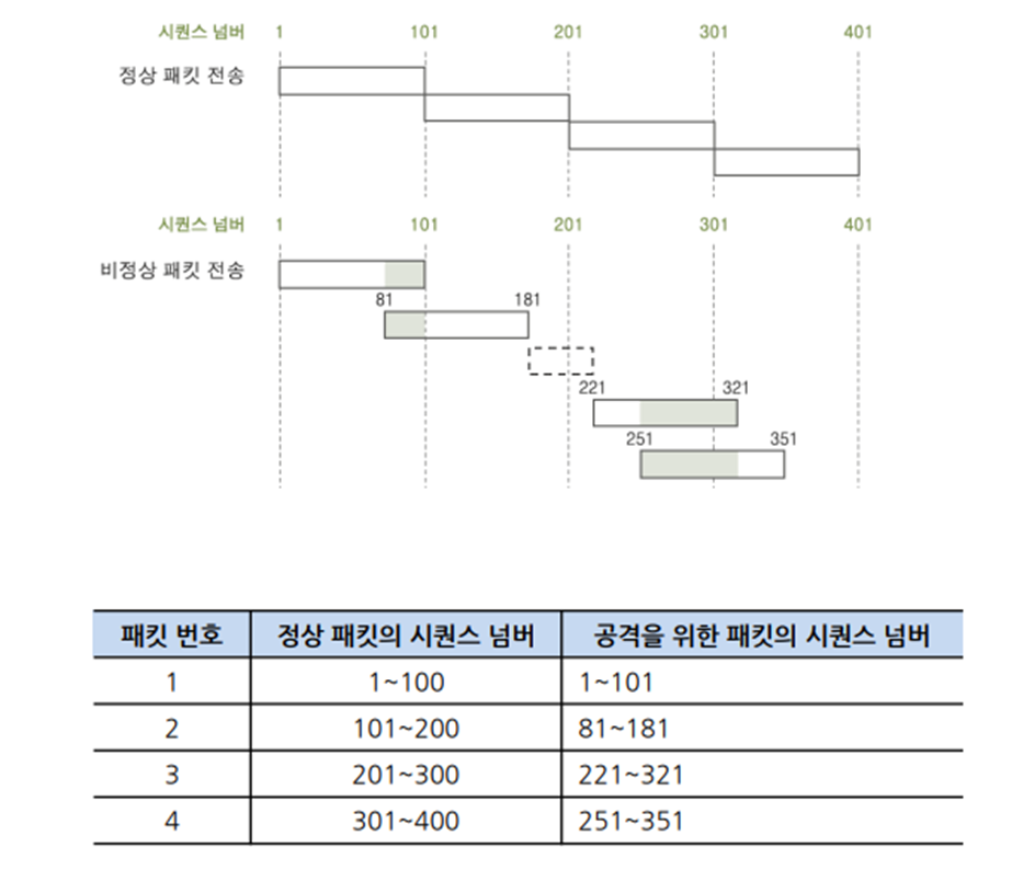 - Boink, Bonk, TearDrop 등 취약점 공격형은 시퀀스 번호를 속여 반복적으로 재요청해 시스템 자원을 고갈시키는데, 이는 반복되는 패킷을 무시하고 버리는 방식으로 해결할 수 있다