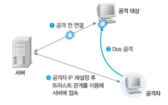 IP 스푸핑 공격은 DoS 공격으로 해당 IP를 네트워크에서 쫓아낸 후 해당 IP로 바꾸어 침입한다