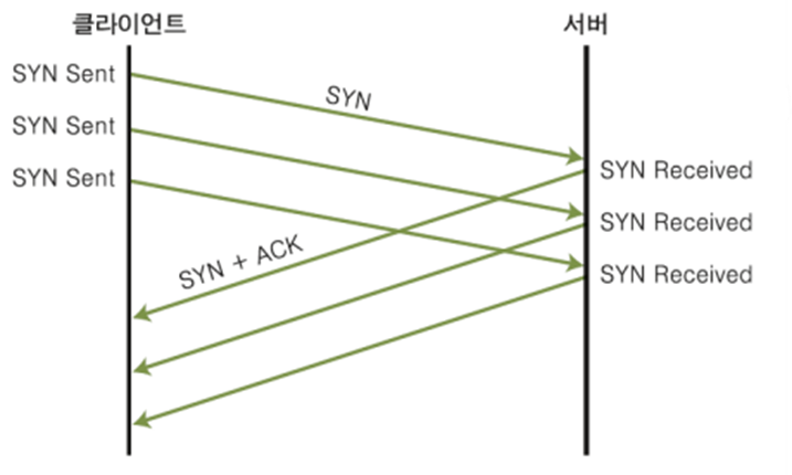 - 마찬가지로 자원 고갈 공격형인 SYN Flooding은 SYN 패킷이 정상적인 서비스를 위한 서버의 공간을 차지하여 다른 사용자가 서비스를 받지 못하게 하는 공격이며, 이는 SYN Received 대기 시간을 줄여 해결할 수 있다