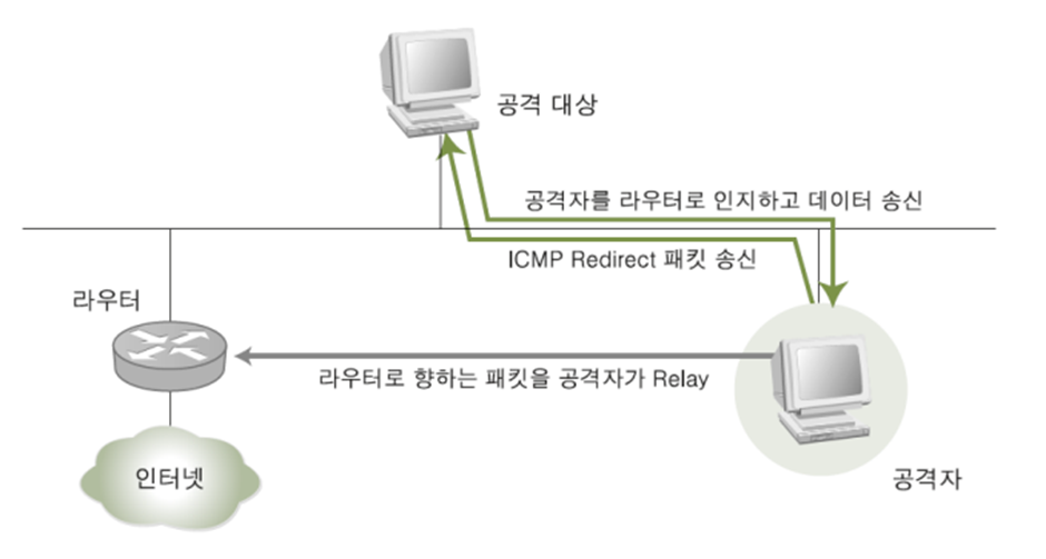 ICMP 리다이렉트는 패킷 전달을 패킷 전달의 효율을 위해 상황에 맞는 라우터를 이용하도록 알리는 것이다. 이를 악용해 데이터가 자신에게 오도록 유도하는 것이 ICMP 리다이렉트 공격이다