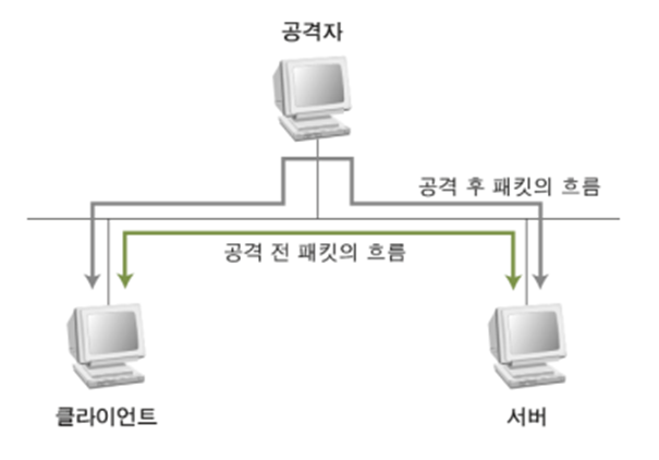 - 서버와 클라이언트가 통신하는 패킷을 공격자가 대신 수신함