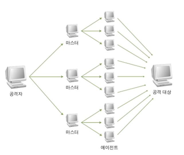분산 서비스 거부(DDoS) 공격은 악성 코드와 결합한 형태의 공격으로, 악성 코드가 봇을 만들어 (봇넷 형성), 공격자의 명령에 따라 일제히 공격하는 방식이다. 마스터는 핸들러 프로그램으로 에이전트를 관리하며, 에이전트는 데몬 프로그램으로 직접 대상을 공격한다