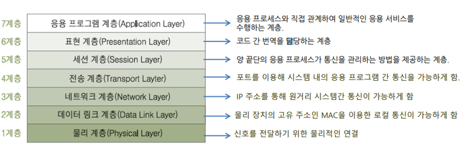 - 전송 계층: 데이터의 전송 방법에 관련된 계층 (TCP/UDP, 포트 번호 관리 등)