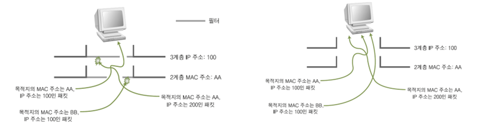 스니핑(= 도청, 태핑(Tapping))은 데이터 속에서 정보를 찾는 것이다. 네트워크 카드는 MAC 주소 (2계층), IP 주소 (3계층)이 일치하는 데이터만 받아들이지만 모든 데이터를 받아들이도록 조작하면 모든 데이터를 볼 수 있다