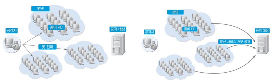 - 공격자가 명령을 내리거나 정해진 스케줄에 따라 일제히 공격을 수행