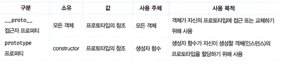 생성자 함수는 생성되는 시점에 prototype 프로퍼티를 추가로 가지는데 이는 모든 객체가 가지는 __proto__ 접근자 프로퍼티와 결국 동일하지만 사용하는 주체가 다르다