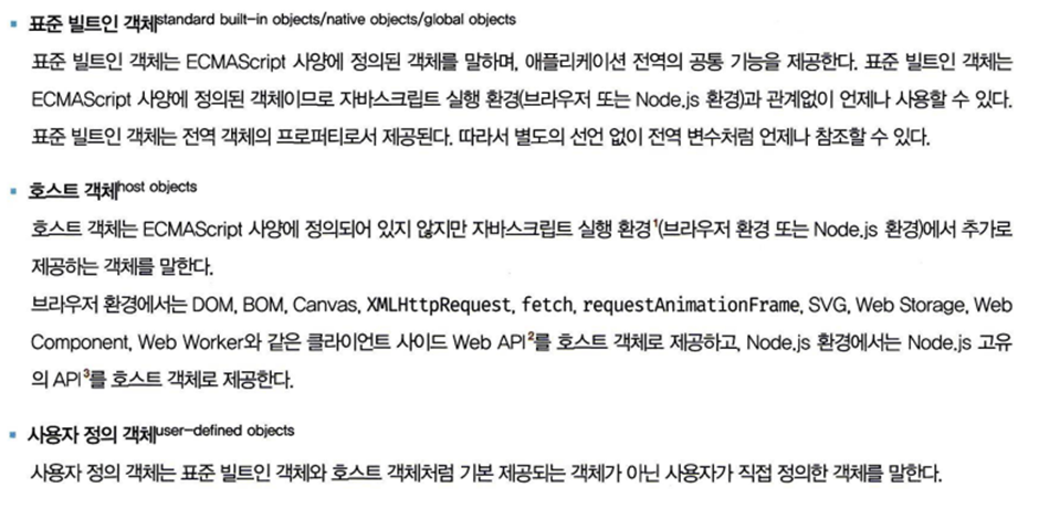 표준 빌트인 객체는 object, String, Number, Boolean, Symbol, Date, Math, RegExp, Array, Map/Set, WeakMap/WeakSet, Function, Promise, Reflect, Proxy, JSON, Error 등 자바스크립트가 제공하는 40여개의 ES 사양에 정의된 객체이다.