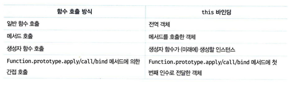 this는 자신이 속한 객체 또는 자신이 생성할 인스턴스를 가리키는 자기 참조 변수로, this를 통해 자신이 속한 객체 또는 자신이 생성할 인스턴스의 프로퍼티나 메서드를 참조할 수 있다