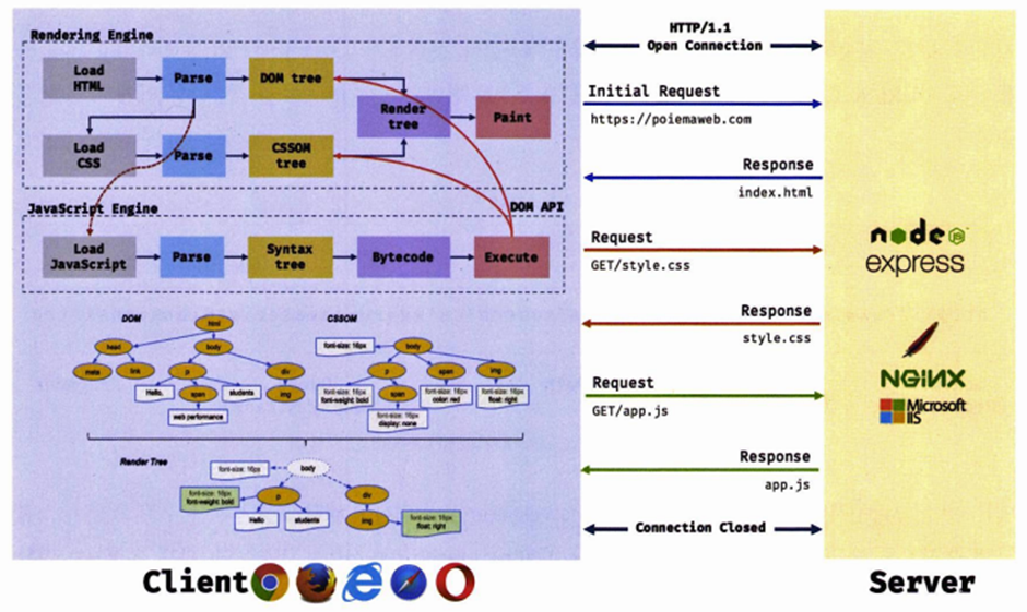 브라우저의 핵심 기능은 필요한 리소스(HTML, CSS, JS, 이미지, 폰트 등의 정적 파일, 서버에서 동적 생성한 데이터)를 서버에 요청하고 응답을 받아 브라우저에 시각적으로 렌더링하는 것이다