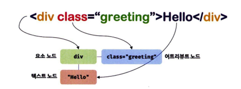 HTML 문서를 구성하는 개별적인 요소인 HTML 요소(element)는 렌더링 엔진에 의해 파싱되어 DOM을 구성하는 노드 객체로 변환된다. 이 때 어트리뷰트는 어트리뷰트 노드로, 텍스트 콘텐츠는 텍스트 노드로 변환된다