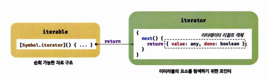 ES6에서 도입된 이터레이션 프로토콜은 순회 가능한 자료구조를 위해 미리 정의한 규칙이다. ES6 이전의 배열, 문자열, 유사 배열 객체, DOM 컬렉션 등은 통일된 규약 없이 다양한 방법으로 순회할 수 있는데, ES6에서는 순회 가능한 자료구조를 이터러블로 통일해 for…of문, 스프레드 문법, 디스트럭처링 할당의 대상으로 사용할 수 있도록 일원화했다