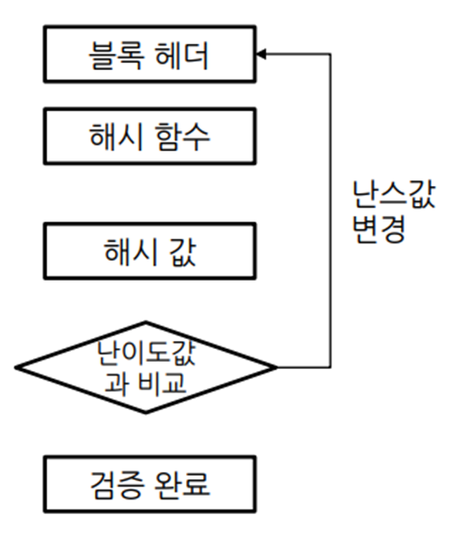이 때 난이도는 블록 생성을 조절하기 위한 수치로, 블록 헤드 중 유일하게 변경될 수 있는 난스(nonce)값을 1씩 증가시키며 난이도 값과 맞는 작업 증명이 될 때까지 반복한다
