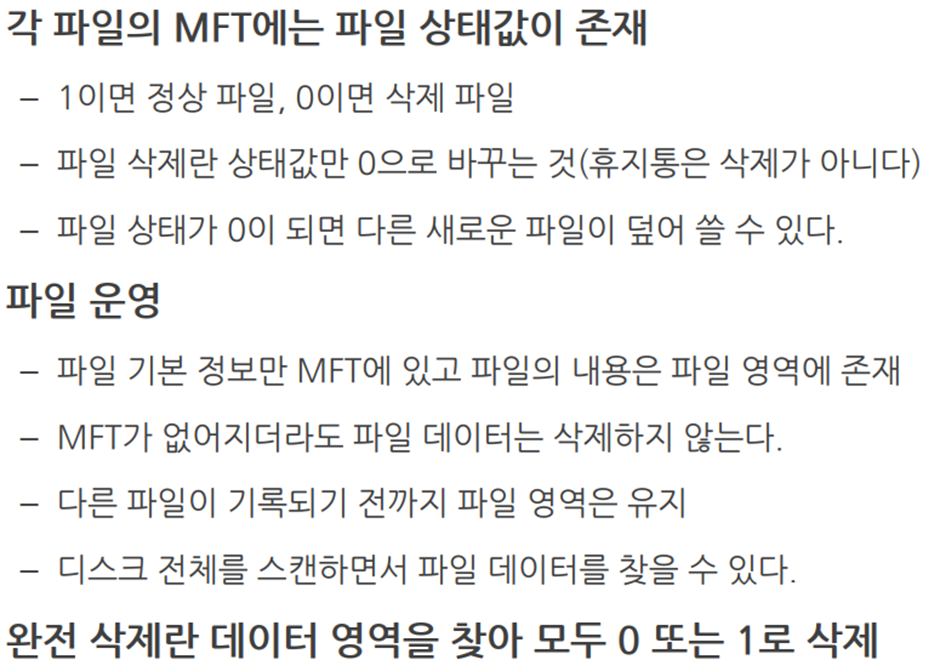 저장 장치는 파일 삭제에 이름, 크기, 생성 시간 등을 저장하는 MFT(Master File Table)를 활용한다