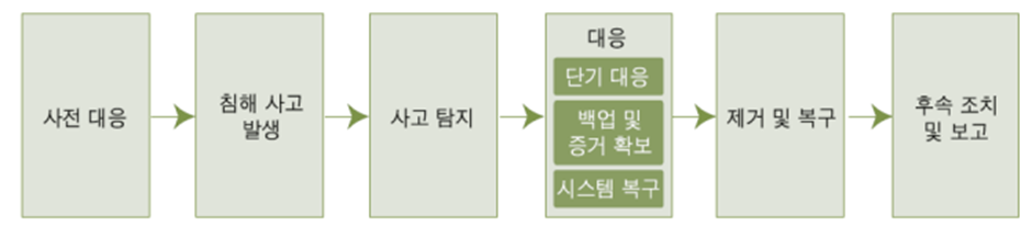 - 보고: 침해 사고 식별과 대응 과정을 기록 문서에 따라 작성 후 문서와 포렌식 과정의 획득 자료를 기반으로 보고서 작성, 원인 파악 및 대응책 마련