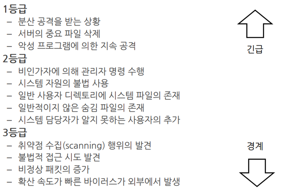 - 2, 3등급: 시스템 담당자를 파악하고 책임자와 접속 경위 조사, 조치가 되지 않았을 경우 대외 기관(한국정보보호진흥원)에 의뢰하고 침입 시도와 대응책이 포함된 보고서 작성 및 공지