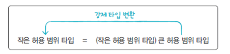 값의 허용 범위가 큰 타입을 작은 타입으로 저장하려 할 경우 강제 타입 변환(casting)이 발생한다