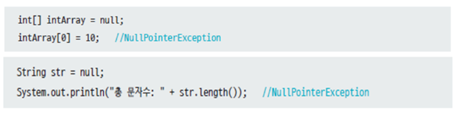 참조 타입 변수는 객체를 참조하지 않는다는 뜻으로 null 값을 가질 수 있는데, 이 또한 스택 영역에 생성되며 null 상태의 변수를 사용할 경우 NullPointerException 오류(예외)가 발생한다
