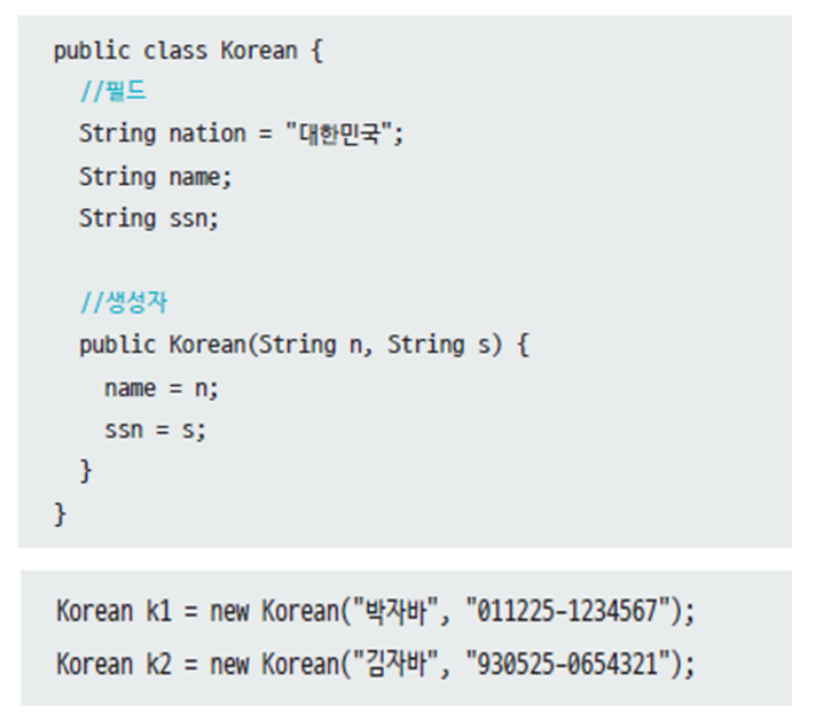 객체를 생성한 후 사용할 수 있는 필드와 메소드를 인스턴스(instance) 멤버라고 하며, 객체 내에서 인스턴스 멤버에게 접근하기 위해서 this를 주로 사용한다