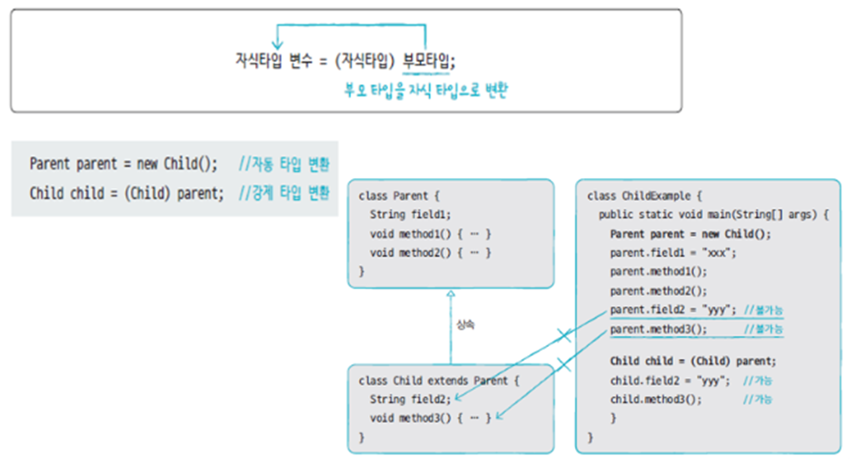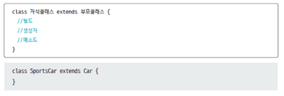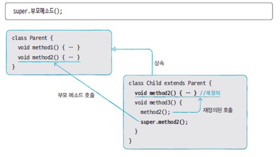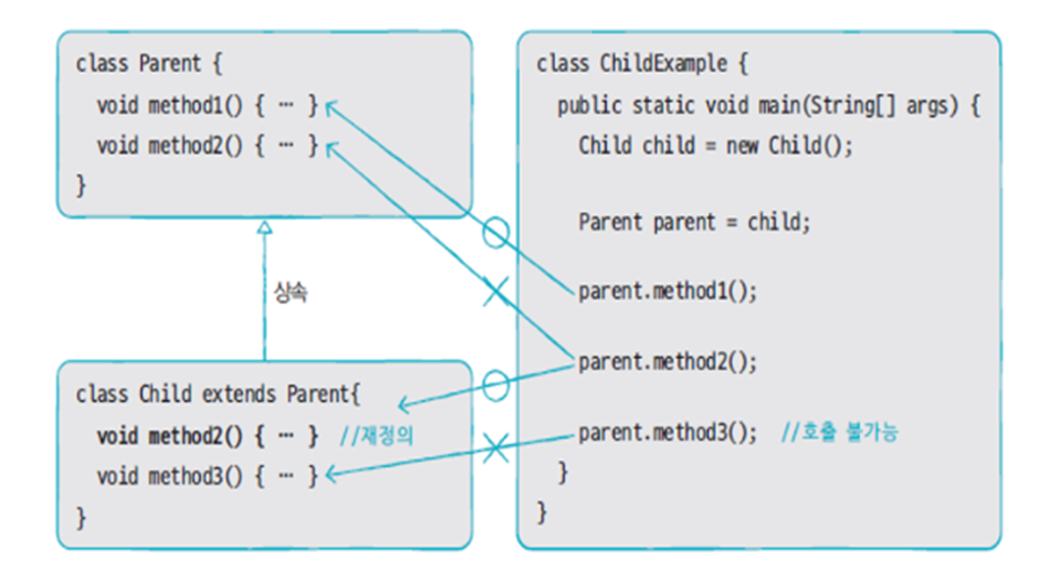 - 부모 클래스에서 private 접근 제한을 갖는 필드와 메소드 상속 제외