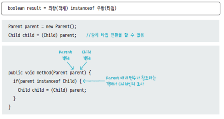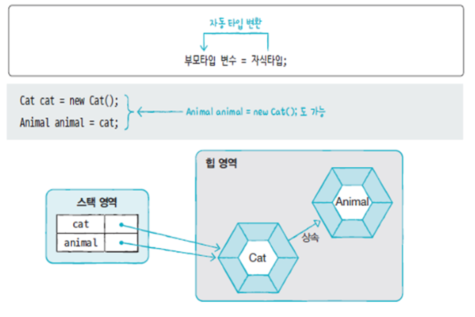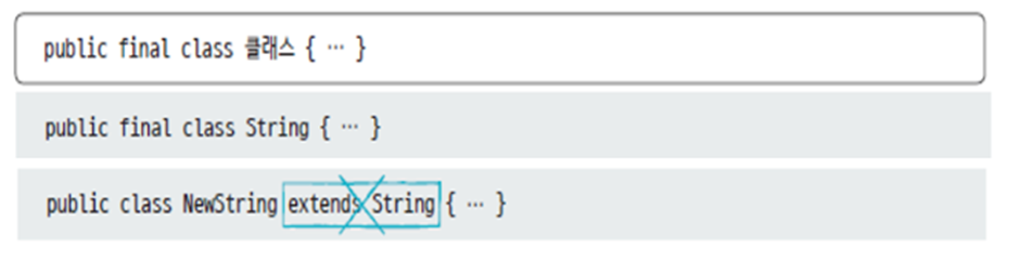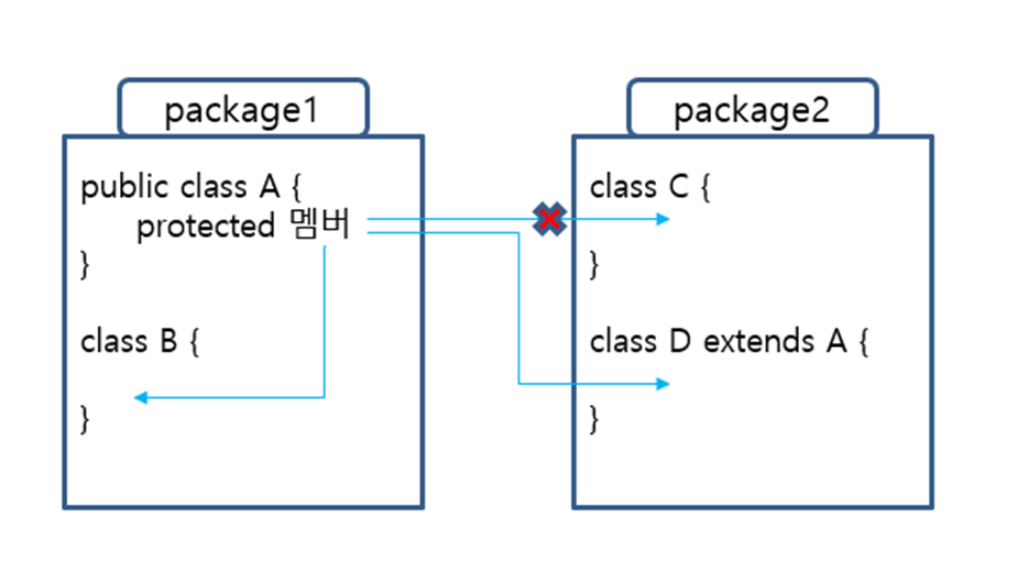 - 부모와 자식 클래스의 패키지가 다를 경우 default 접근 제한을 갖는 필드와 메소드 상속 제외