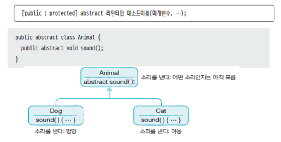 abstract 키워드로 구현하며 필드/생성자/메소드를 선언해 super 키워드로 호출될 수 있다