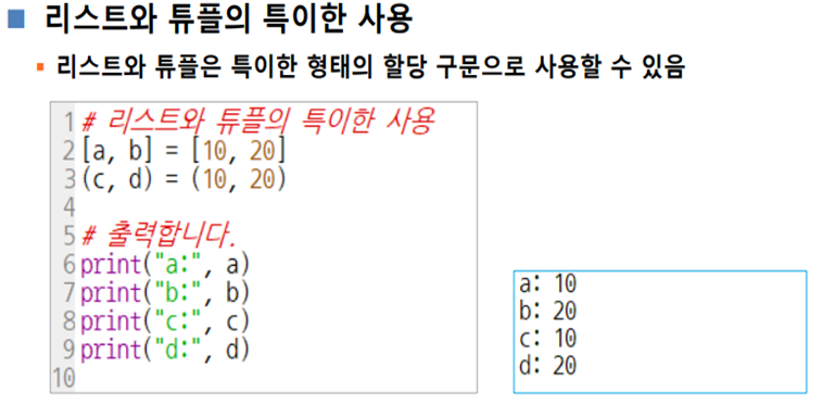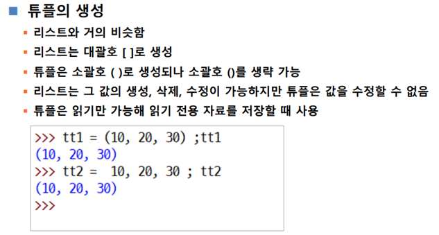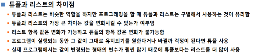 항목의 변화 가능 여부가 가장 큰 차이! (리스트 가변 / 튜플 불변)