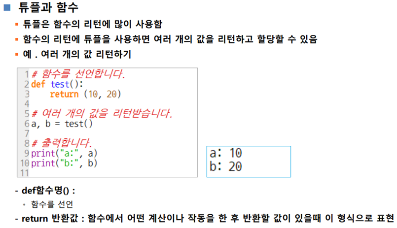 함수와 return으로 값을 미리 지정한 후 튜플에 넣는 형식