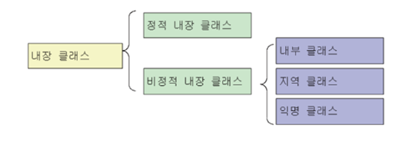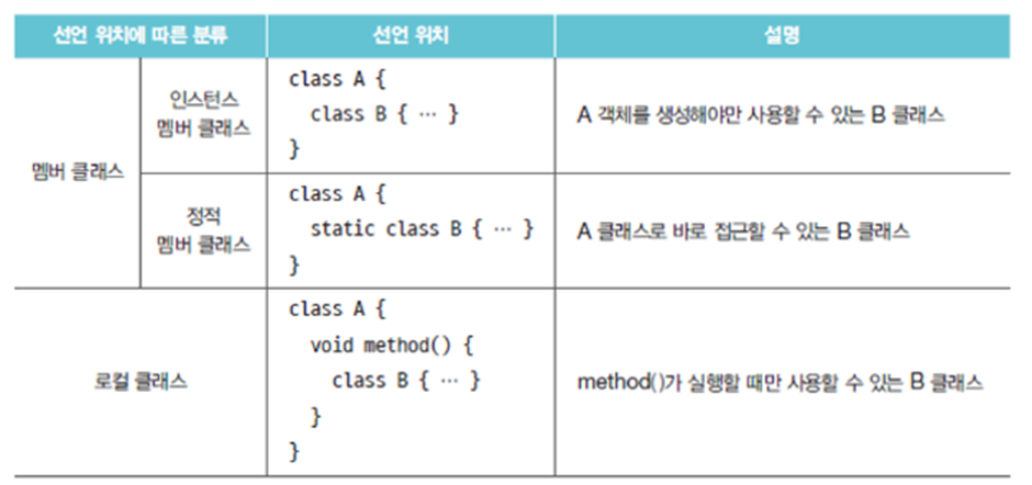 클래스의 멤버로서 선언되는 중첩 클래스를 멤버 클래스라고도 하며, 메소드 내부에서 선언되는 중첩 클래스는 로컬 클래스라 한다 (메소드가 종료되면 사라짐)