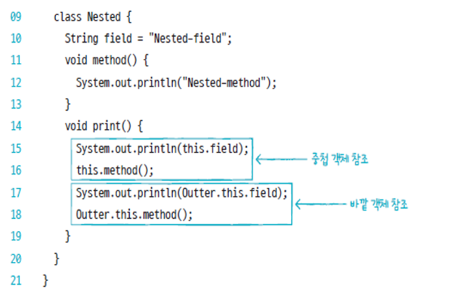 클래스 내부에 선언한 클래스를 중첩 클래스(nested class)라 하며, 클래스 내부에 선언한 인터페이스를 중첩 인터페이스(nested interface)라 한다