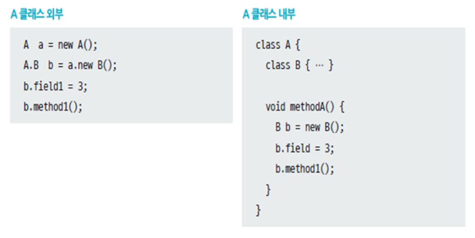 static 키워드 없이 중첩 선언된 클래스를 인스턴스 멤버 클래스라 하며, 정적 필드와 메소드가 아닌 인스턴스 필드와 메소드만 선언 가능하다