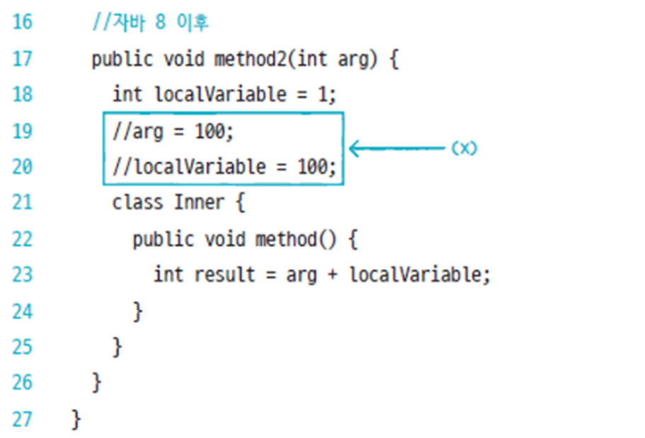 - 메소드의 매개/로컬 변수를 익명 객체 내부에서 사용할 경우 지속 사용 불가