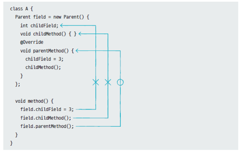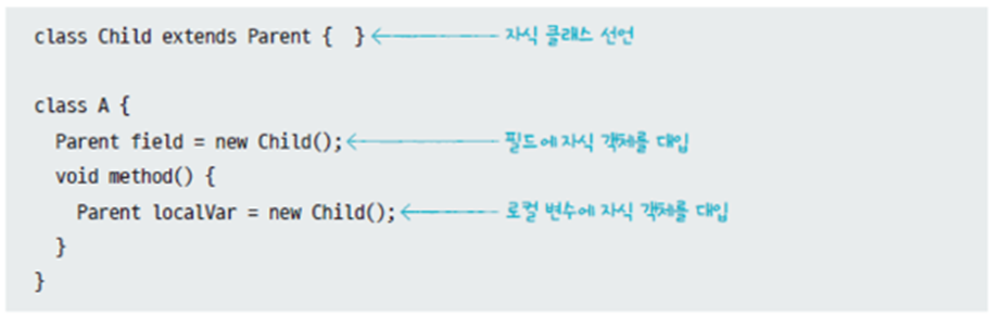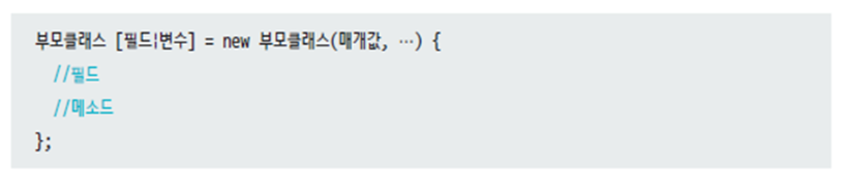부모 클래스를 상속하는 자식 클래스를 선언하고 new 연산자를 이용하여 자식 객체를 부모 타입 필드나 변수의 초기값에 대입해 익명 자식 객체를 생성할 수 있다
