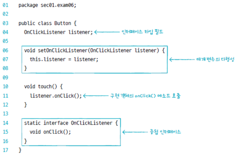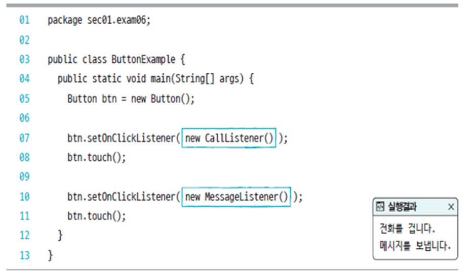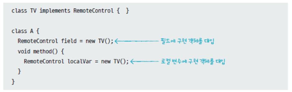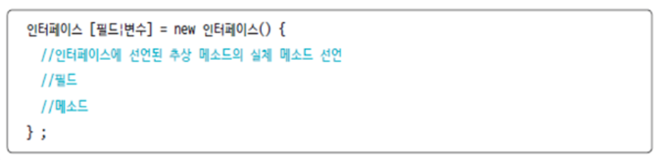 비슷하게 인터페이스 타입의 필드 혹은 변수를 선언 후 new 연산자를 이용한 구현 객체를 초기값으로 대입해 익명 구현 객체를 생성할 수 있다
