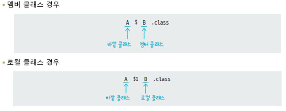 클래스의 멤버로서 선언되는 중첩 클래스를 멤버 클래스라고도 하며, 메소드 내부에서 선언되는 중첩 클래스는 로컬 클래스라 한다 (메소드가 종료되면 사라짐)