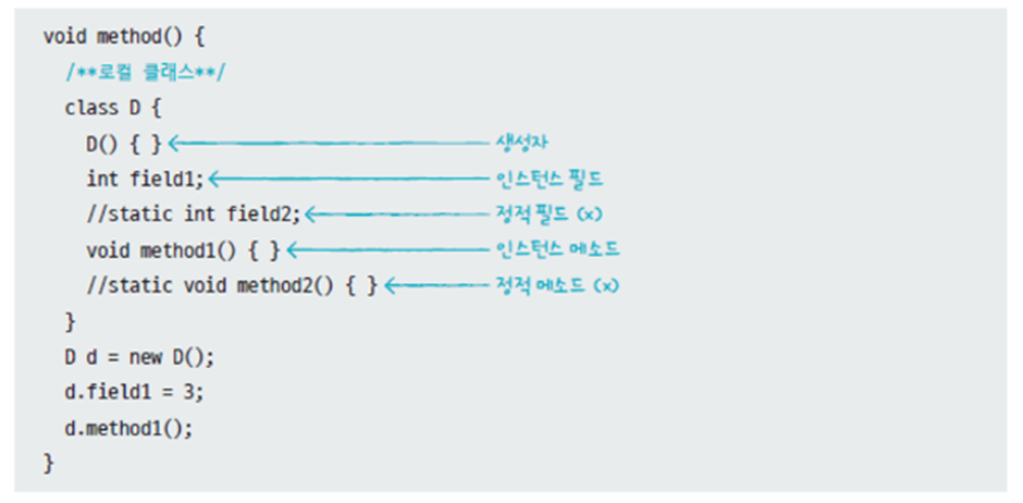 메소드 내부에서 선언할 수 있는 로컬 클래스는 접근 제한자 및 static 사용이 불가능하다
