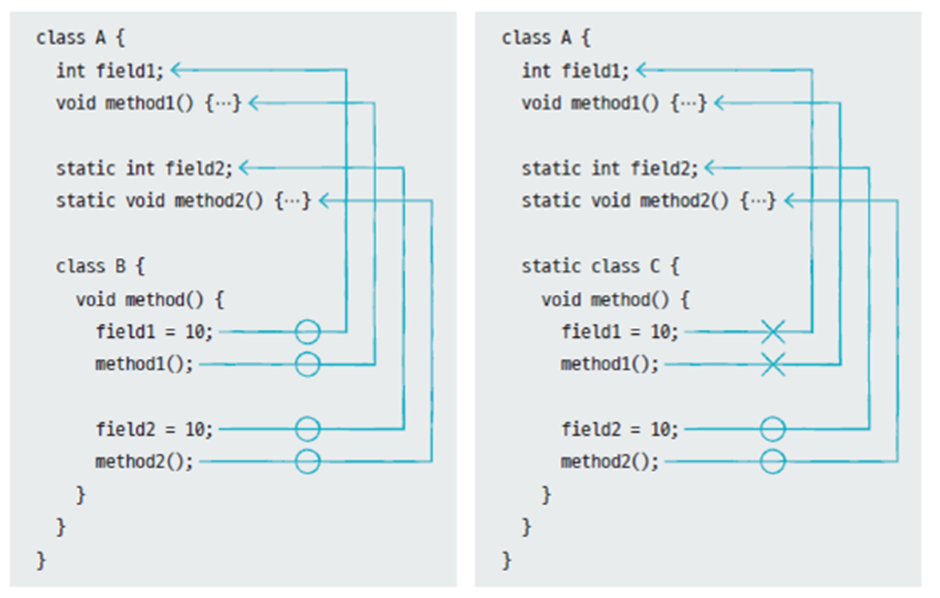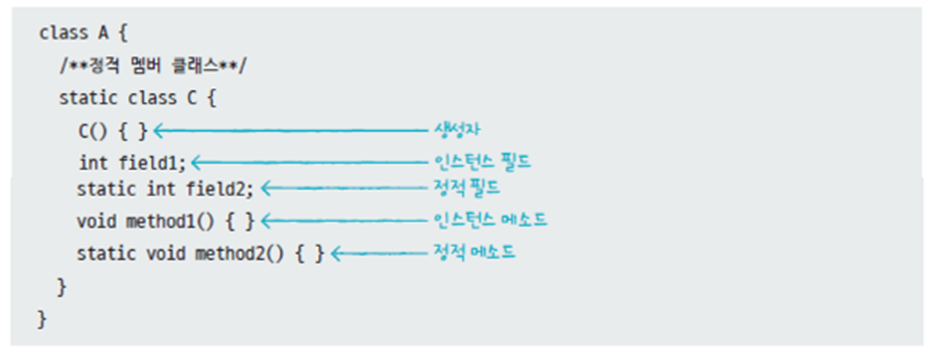 반면 static 키워드로 선언된 정적 멤버 클래스는 모든 종류의 필드와 메소드가 선언 가능하다
