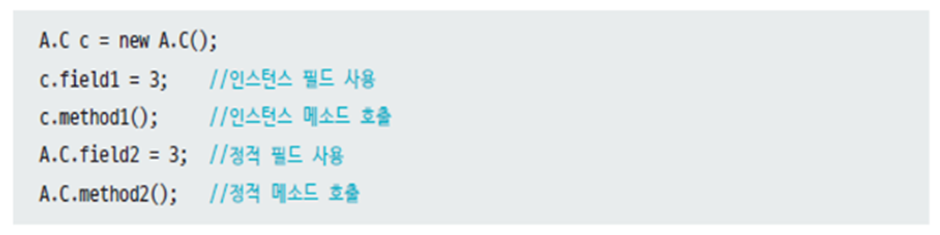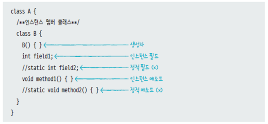 static 키워드 없이 중첩 선언된 클래스를 인스턴스 멤버 클래스라 하며, 정적 필드와 메소드가 아닌 인스턴스 필드와 메소드만 선언 가능하다