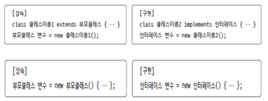 이름이 없는 익명(anonymous) 객체는 어떤 클래스를 상속하거나 인터페이스를 구현해야 한다